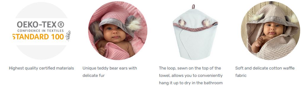 Hood with unique teddy bear ears, designed in the towel will also cover the child's head, warming the little one even more.