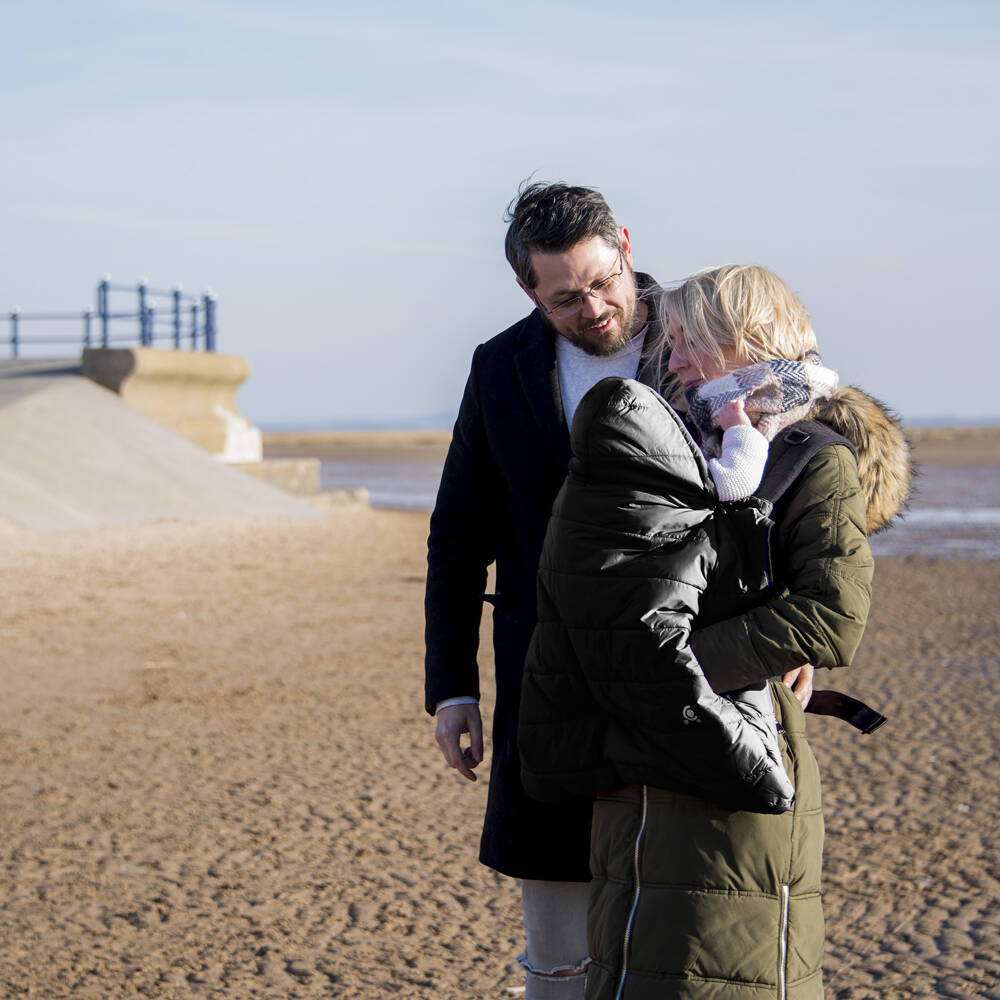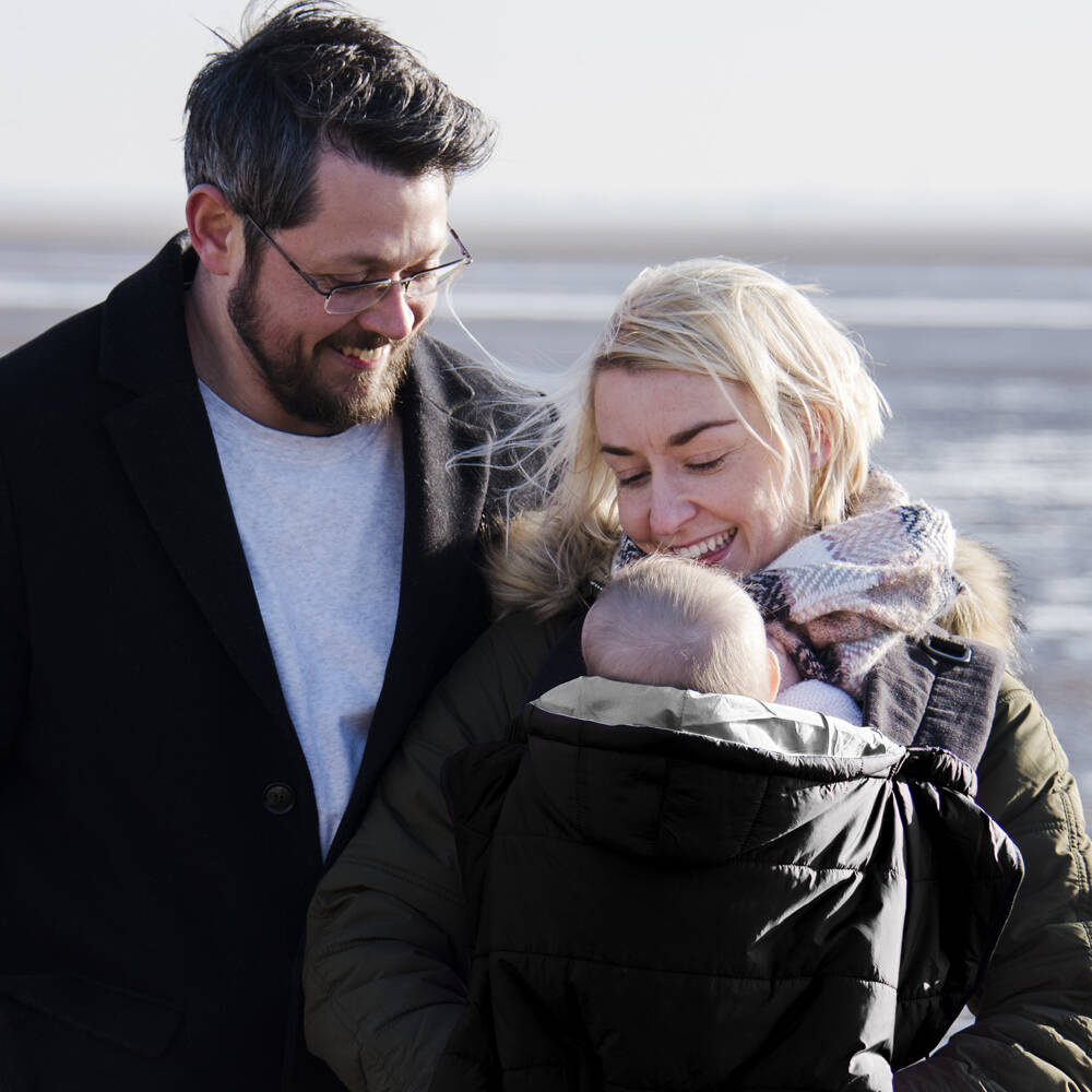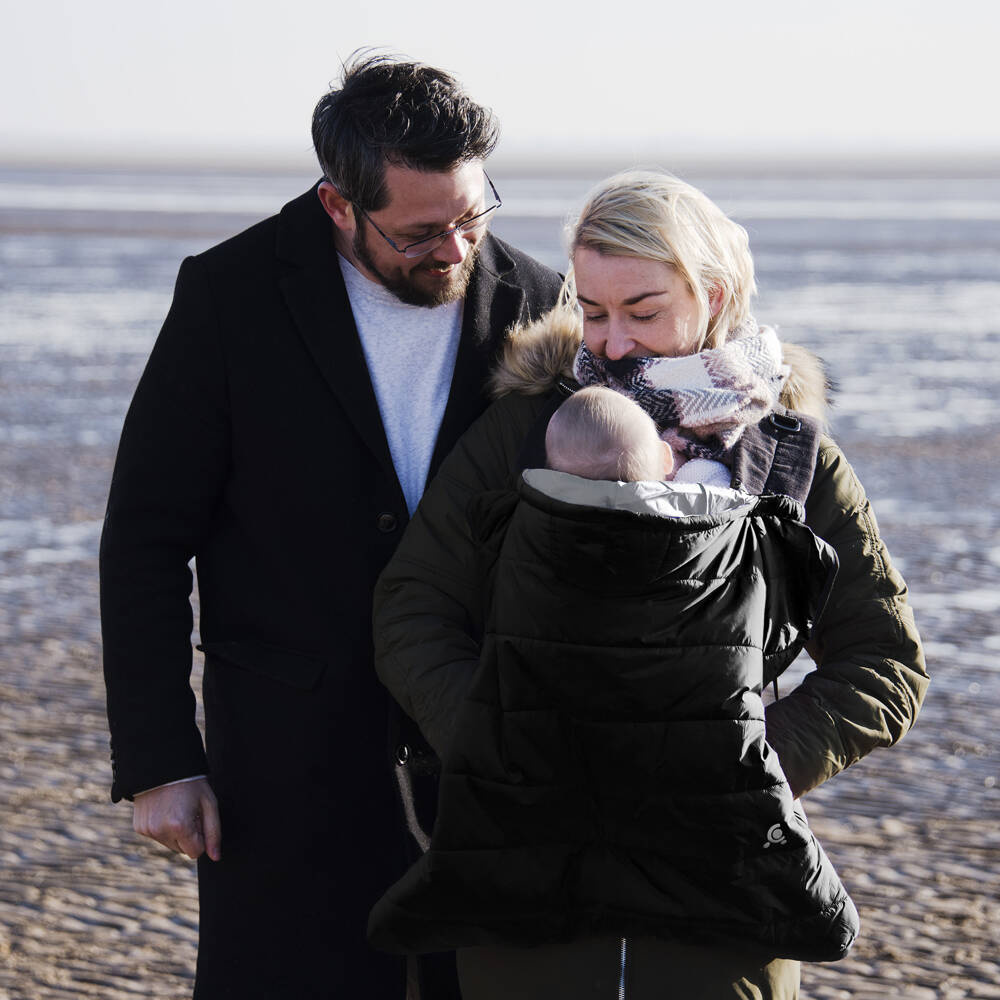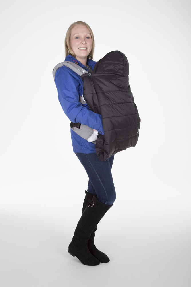 This baby carrier cape can be used with any baby carrier in forward or parent facing mode, to shield baby from wind and rain.
