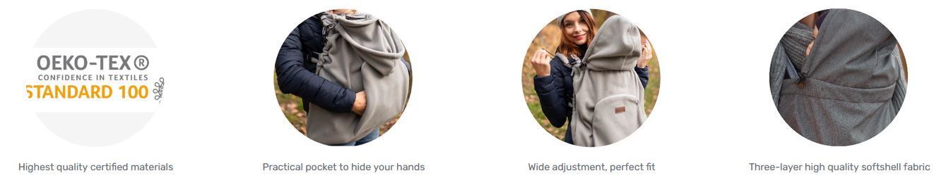 The covers are adjustable in width around the neck and in height along the entire length, which makes them suitable for little and older children. The cover can be easily put on and attached to the carrier with snaps located in the upper and side parts.