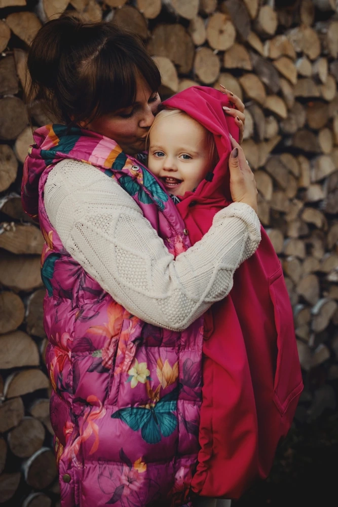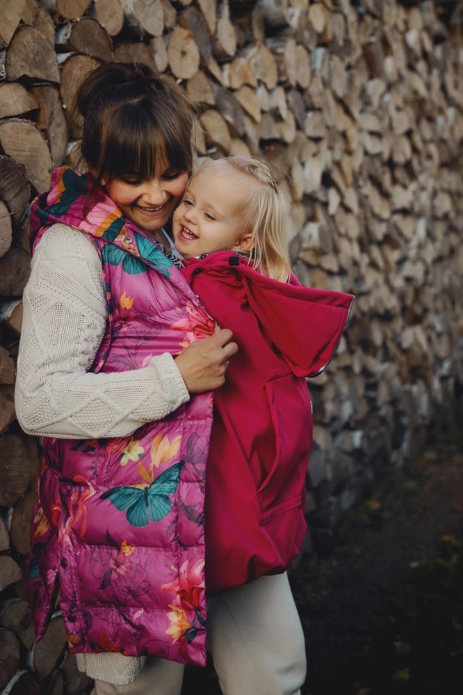 Innovative regulation system: the cover is fastened on the shoulder straps of the carrier or on the shoulders of the sling, and the width and height of the cover can be adjusted with rubber bands sewn around the cover. The whole system is easy to use.