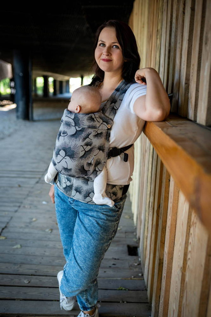 Zatrzaski regulujące wysokość kołnierza są ozdobą nosidełka i dodają mu uroku. Do regulacji długości pasów naramiennych wykorzystaliśmy taśmę regulacyjną i delikatne magnesy, które mają utrzymać tkaninę na odpowiednim miejscu gdy nosimy dziecko na plecach. Natomiast pas biodrowy i znajdująca się na nim regulacja szerokości panelu jest totalną innowacją, której nie znajdziecie nigdzie indziej. Dzięki wykorzystaniu opasek na taśmie regulacyjnej przede wszystkim możemy bardzo precyzyjnie wyregulować nosidełko, a dodatkowo panel przepięknie i bardzo estetycznie układa się w zakładki.
