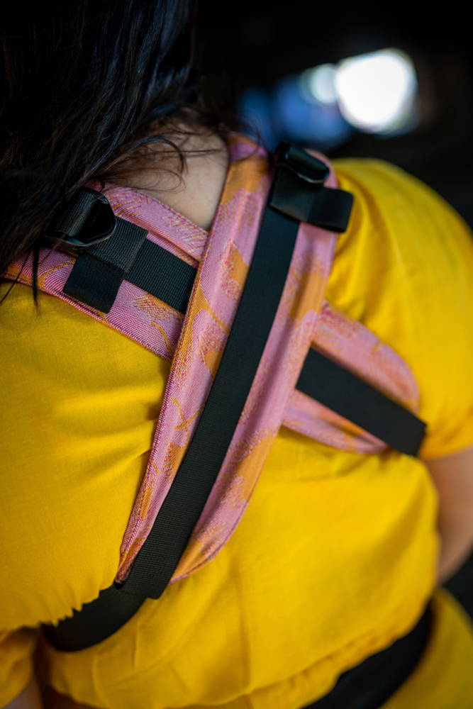 Zatrzaski regulujące wysokość kołnierza są ozdobą nosidełka i dodają mu uroku. Do regulacji długości pasów naramiennych wykorzystaliśmy taśmę regulacyjną i delikatne magnesy, które mają utrzymać tkaninę na odpowiednim miejscu gdy nosimy dziecko na plecach. Natomiast pas biodrowy i znajdująca się na nim regulacja szerokości panelu jest totalną innowacją, której nie znajdziecie nigdzie indziej. Dzięki wykorzystaniu opasek na taśmie regulacyjnej przede wszystkim możemy bardzo precyzyjnie wyregulować nosidełko, a dodatkowo panel przepięknie i bardzo estetycznie układa się w zakładki.