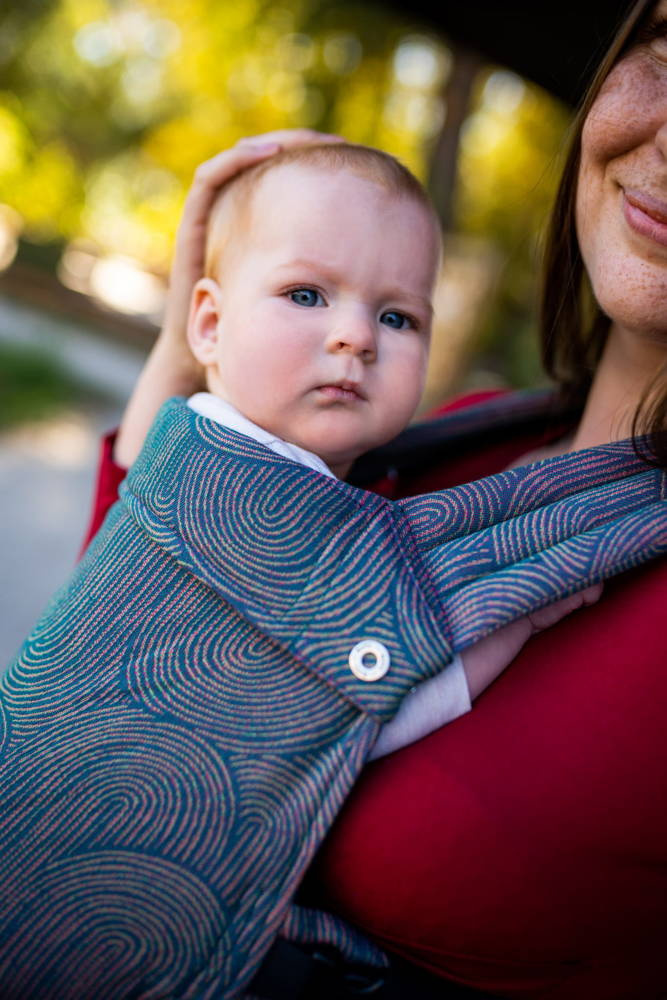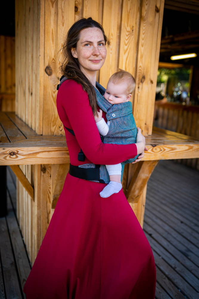 Zatrzaski regulujące wysokość kołnierza są ozdobą nosidełka i dodają mu uroku. Do regulacji długości pasów naramiennych wykorzystaliśmy taśmę regulacyjną i delikatne magnesy, które mają utrzymać tkaninę na odpowiednim miejscu gdy nosimy dziecko na plecach. Natomiast pas biodrowy i znajdująca się na nim regulacja szerokości panelu jest totalną innowacją, której nie znajdziecie nigdzie indziej. Dzięki wykorzystaniu opasek na taśmie regulacyjnej przede wszystkim możemy bardzo precyzyjnie wyregulować nosidełko, a dodatkowo panel przepięknie i bardzo estetycznie układa się w zakładki.