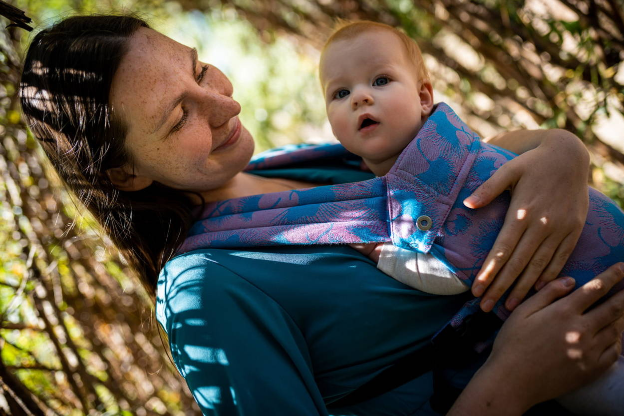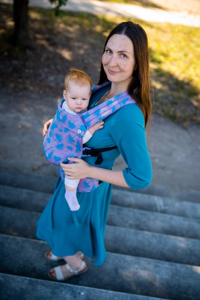 Zatrzaski regulujące wysokość kołnierza są ozdobą nosidełka i dodają mu uroku. Do regulacji długości pasów naramiennych wykorzystaliśmy taśmę regulacyjną i delikatne magnesy, które mają utrzymać tkaninę na odpowiednim miejscu gdy nosimy dziecko na plecach. Natomiast pas biodrowy i znajdująca się na nim regulacja szerokości panelu jest totalną innowacją, której nie znajdziecie nigdzie indziej. Dzięki wykorzystaniu opasek na taśmie regulacyjnej przede wszystkim możemy bardzo precyzyjnie wyregulować nosidełko, a dodatkowo panel przepięknie i bardzo estetycznie układa się w zakładki.