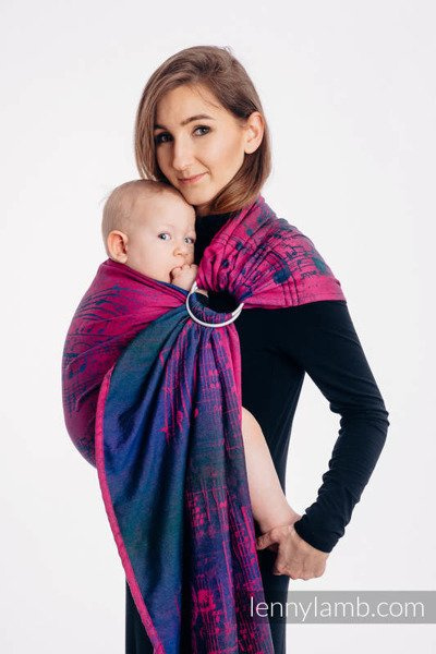 Ring Sling is simple to use and allow you to carry a baby in many different ways – front or back positions (suitable for older children) or hip carry. Good for short walk or fast shopping, because weighs down your spine asymmetrically. You can always take your ring sling with you because it takes up little space and can be pre-tied.