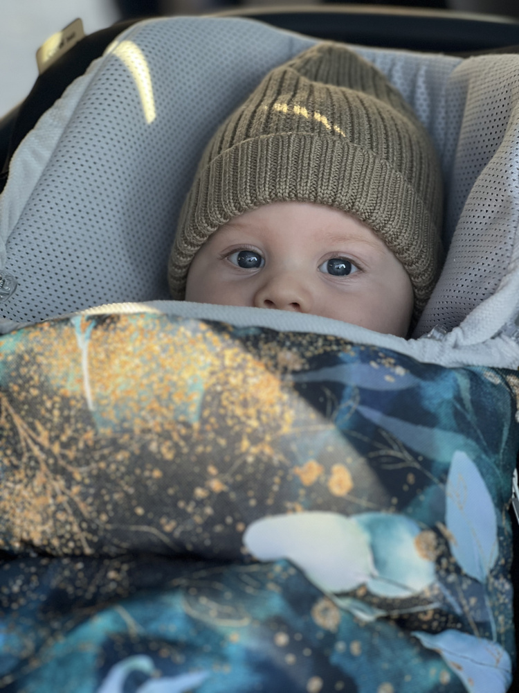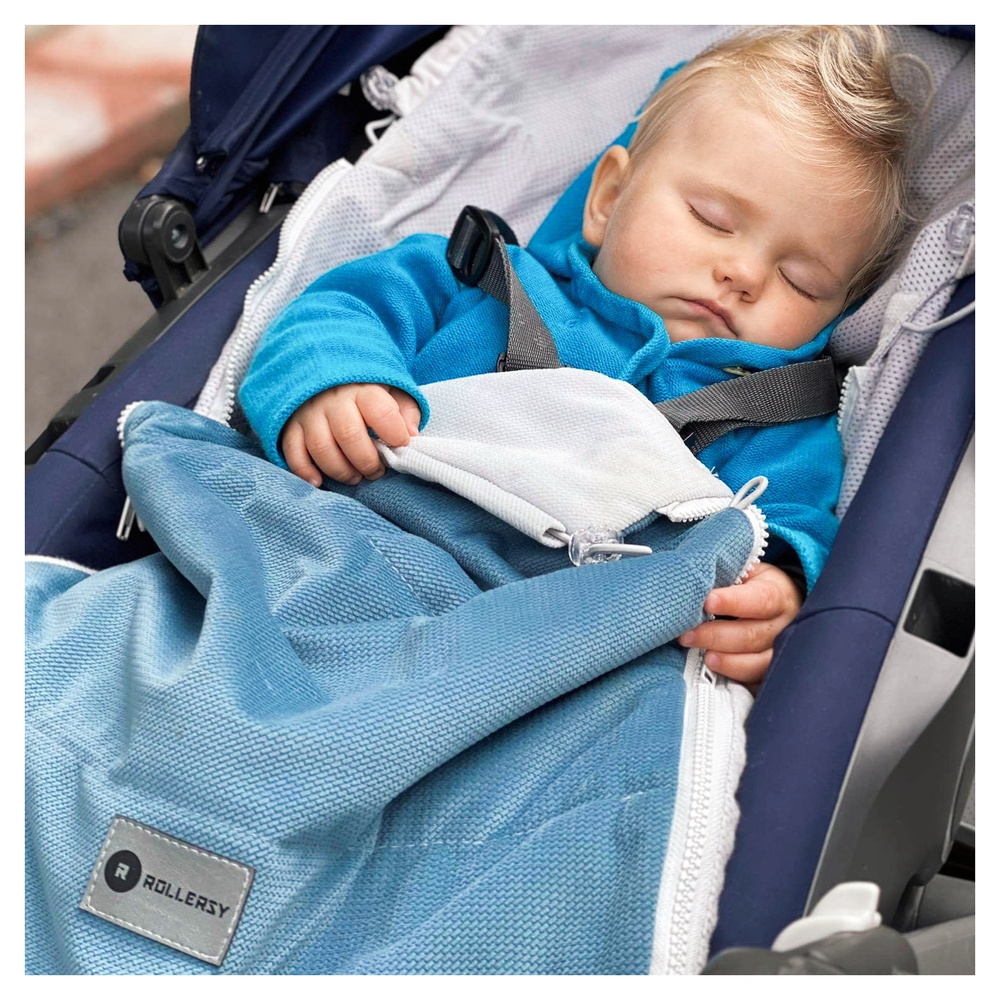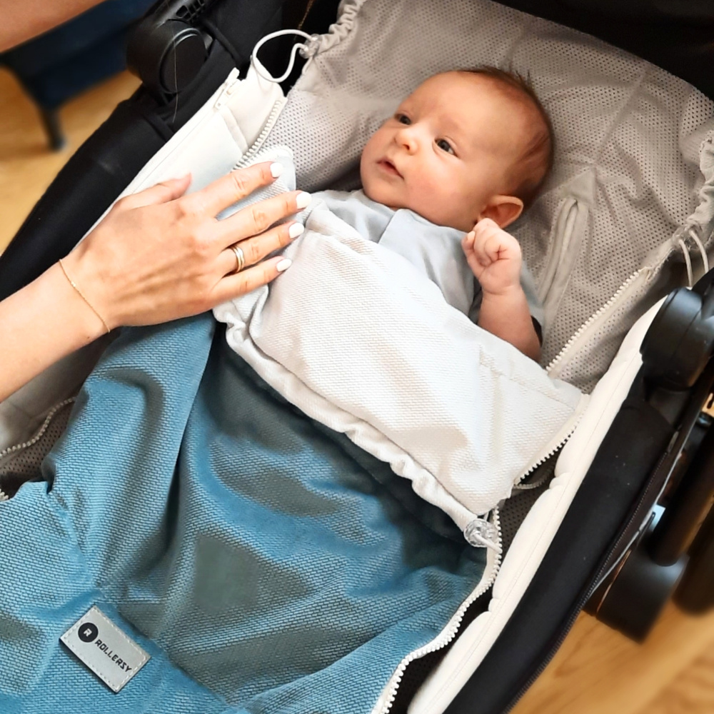The little traveler’s footmuff is ideal for both car and long walks. When traveling by car, simply unfasten the cover. The child is correctly fastened with the harness close to the body without the risk of the seat belts slipping off the jacket or overalls.