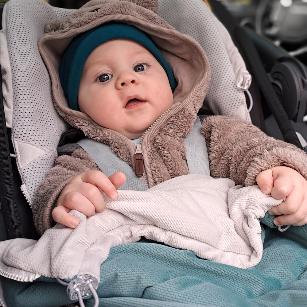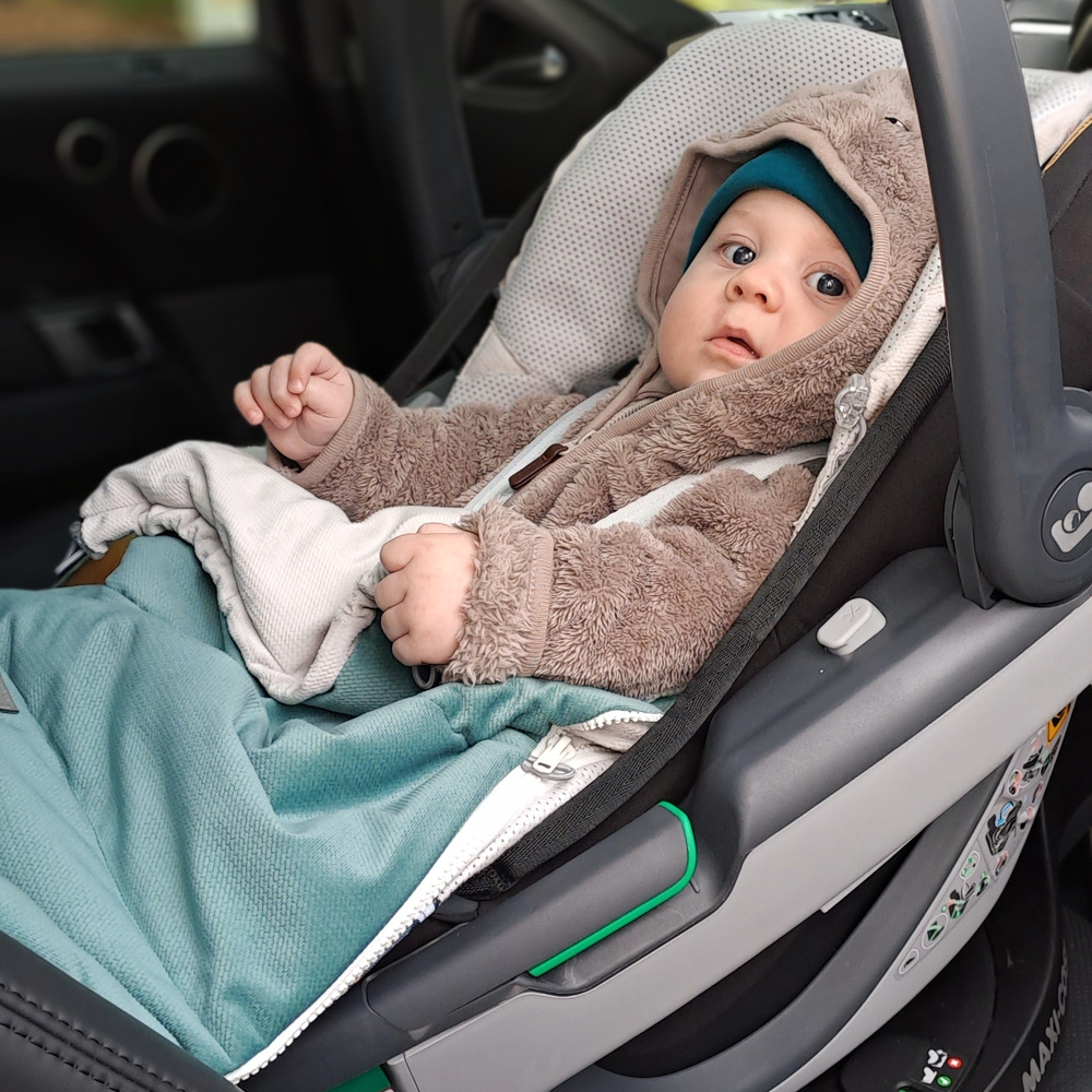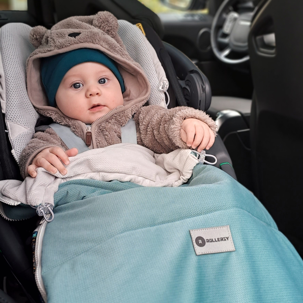 3-part, multi-functional footmuff for car seats (with 3- and 5-point harness) and strollers.