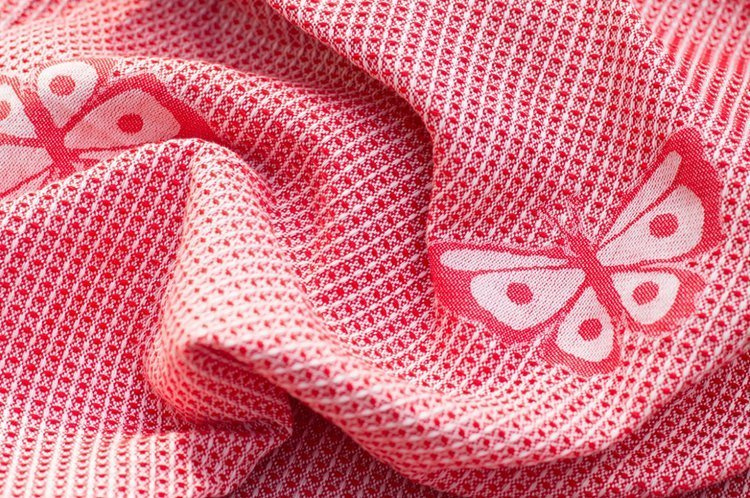 Happy butterfly is very soft 100% combed cotton wrap. Jacquard weave and wafer weave have given a wonderful effect of a very soft wrap. Nevertheless very supportive at the same time. We recommend them for all babywearing time.