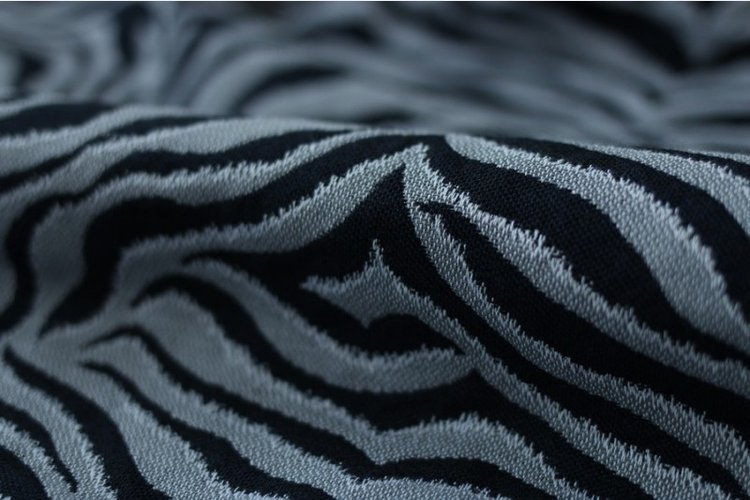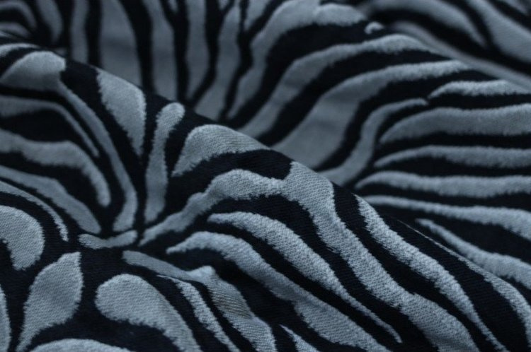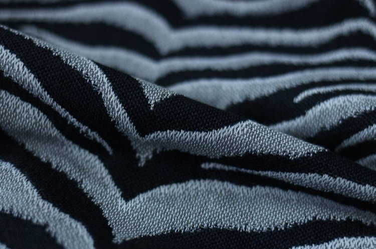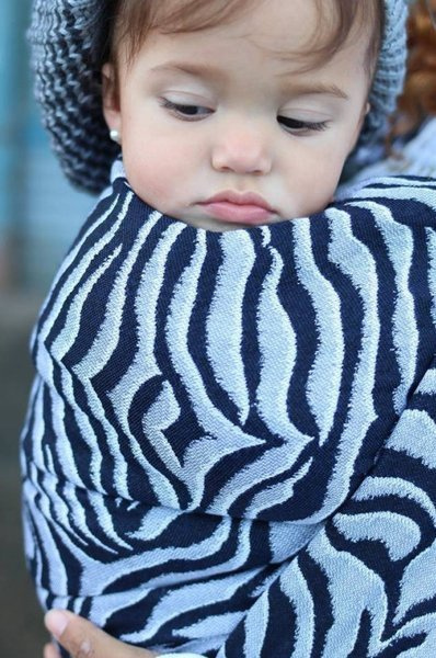 Luxury, soft Tiger in a combination of a dark navy with silver-grey. This wrap has not only a chic look but also a lush blend with Royal Baby Alpaca wool. It breaks in fast and wraps easy, which makes this suitable for all experience levels. Not too thick for small babies, strong enough for toddlers. Soft, gentle and airy on the body.