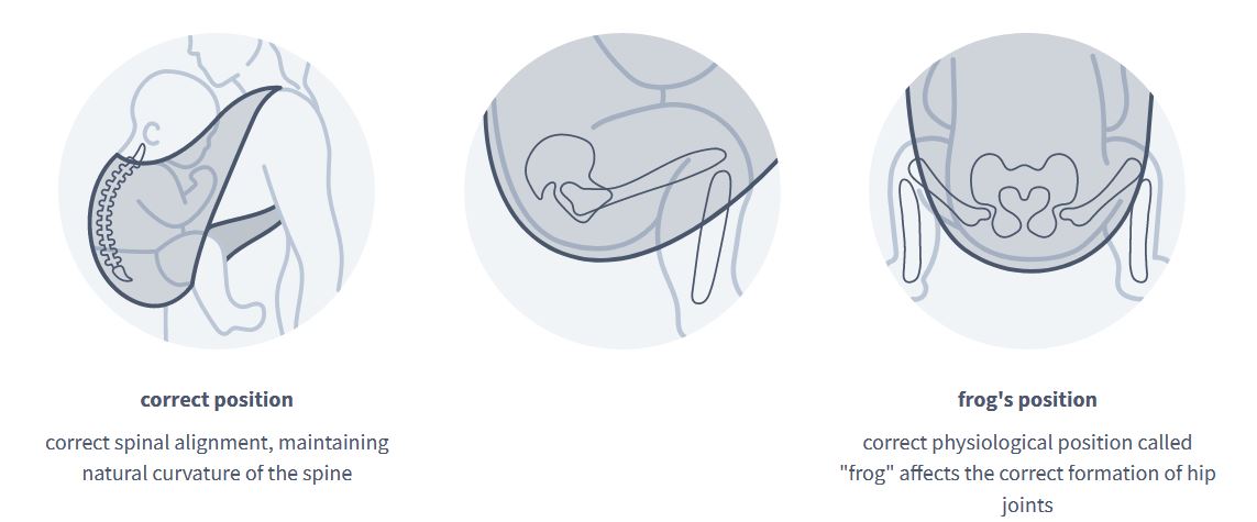 - when you are carrying your baby, the sling supports the baby’s back perfectly, giving it a “C” shape (natural curve of a new-born’s spine), and positions the pelvis correctly, which allows the hip joints to be positioned in a manner that supports their normal development (legs should be spread out at an angle of about 60 ° - 90 ° relative to the body axis, and the knees should be slightly higher than the bottom (the so-called “M” letter)