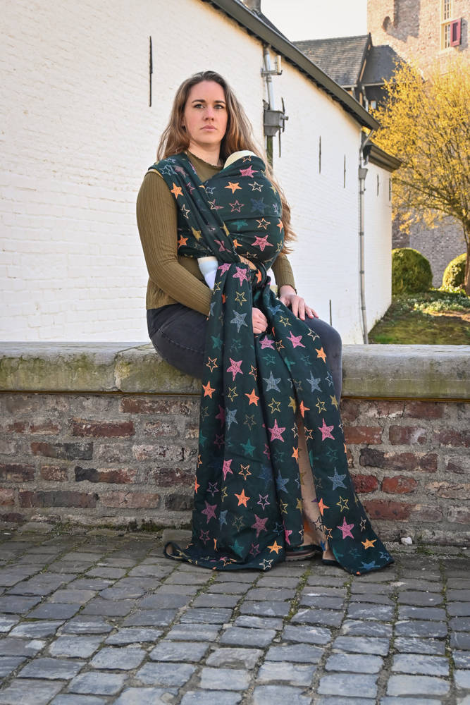 Stellar to kolejna chusta w kombinacji kolorystycznej, która zmienia się pod wpływem światła, w jednej chwili tkanina wygląda na głęboką ciemną zieleń, a w następnej na czerń. Jest to bawełniana chusta easycare, miękka już w opakowaniu, a po praniu i użytkowaniu będzie jeszcze bardziej miękka. Chusta łatwo się wiąże, ma przyczepność i wystarczającą sprężystość, co daje duży komfort noszenia.