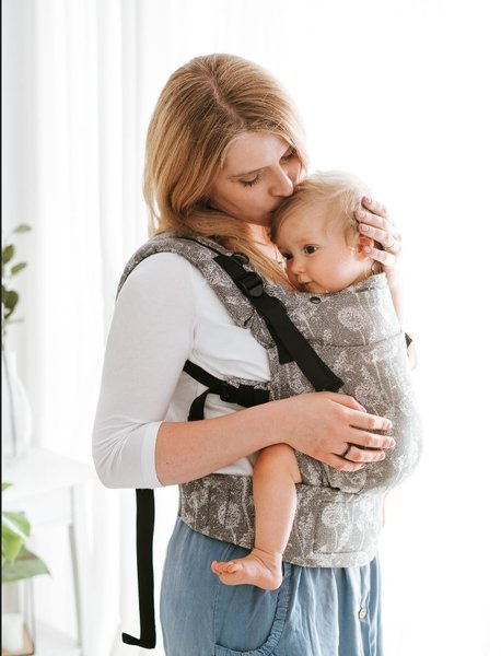 Nosidełko ma szeroki pas biodrowy, który wraz z mocno wypełnionymi pasami naramiennymi zabiera ciężar z Twoich ramion. Gdy twoje dziecko urośnie możesz dodatkowo podtrzymać śpiącą główkę kapturkiem, który jest dołączony do każdego nosidełka.