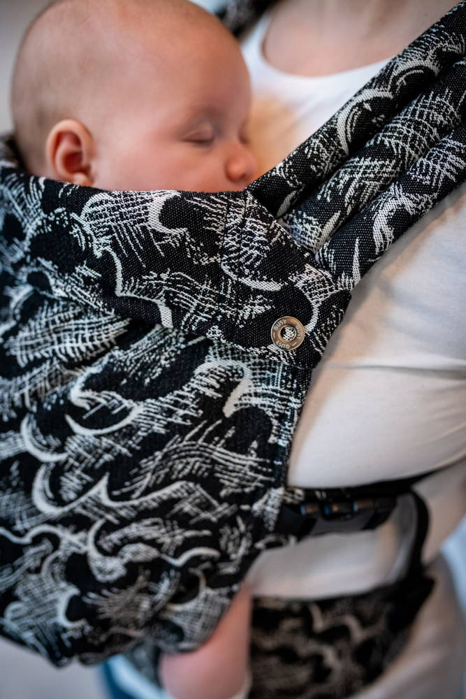 Zatrzaski regulujące wysokość kołnierza są ozdobą nosidełka i dodają mu uroku. Do regulacji długości pasów naramiennych wykorzystaliśmy taśmę regulacyjną i delikatne magnesy, które mają utrzymać tkaninę na odpowiednim miejscu gdy nosimy dziecko na plecach. Natomiast pas biodrowy i znajdująca się na nim regulacja szerokości panelu jest totalną innowacją, której nie znajdziecie nigdzie indziej. Dzięki wykorzystaniu opasek na taśmie regulacyjnej przede wszystkim możemy bardzo precyzyjnie wyregulować nosidełko, a dodatkowo panel przepięknie i bardzo estetycznie układa się w zakładki.