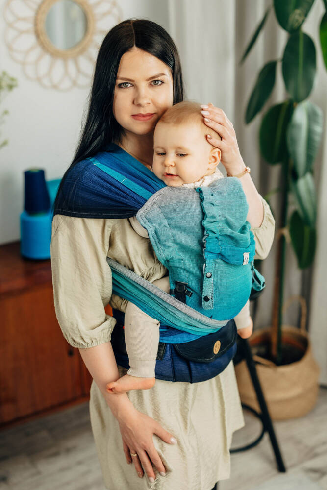Funkcjonalność: dwie pozycje noszenia- z przodu od urodzenia oraz na plecach od czwartego miesiąca życia. Wielopoziomowa regulacja panelu oraz chustowe pasy ramienne zapewniają doskonałe dopasowanie oraz prawidłową, ergonomiczną pozycję dziecka na każdym etapie rozwoju